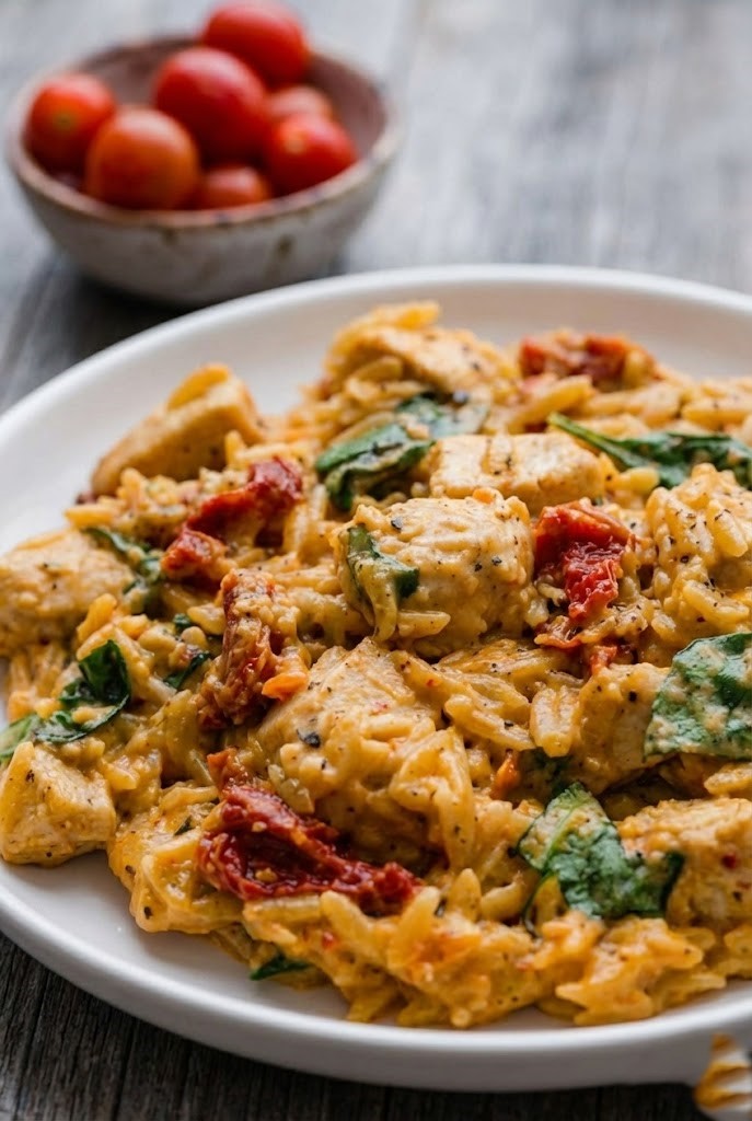 Once the orzo has softened, return the cooked chicken to the skillet. Stir in the halved tomatoes and baby spinach until the spinach wilts. The tomatoes will burst slightly, adding freshness to the dish. Let everything simmer for another minute so the flavors blend together.