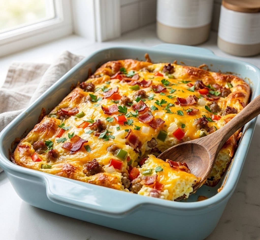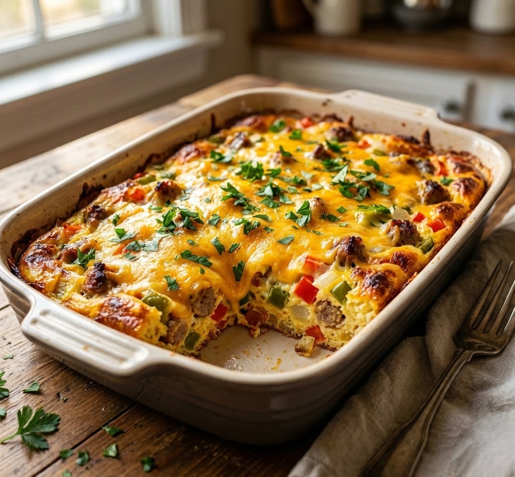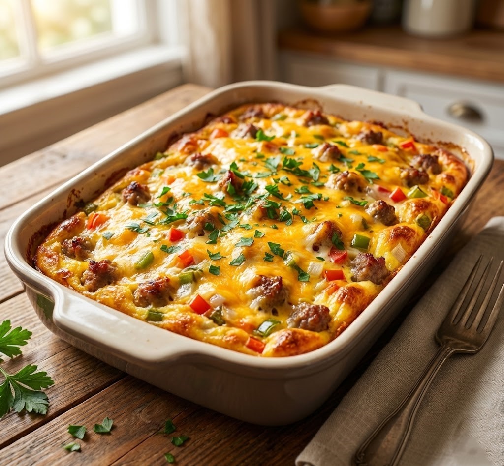 It’s a one-dish meal that combines eggs, sausage, bread, cheese, and vegetables into a delicious, comforting breakfast. I always feel proud serving it to family or friends because it looks and tastes incredible.