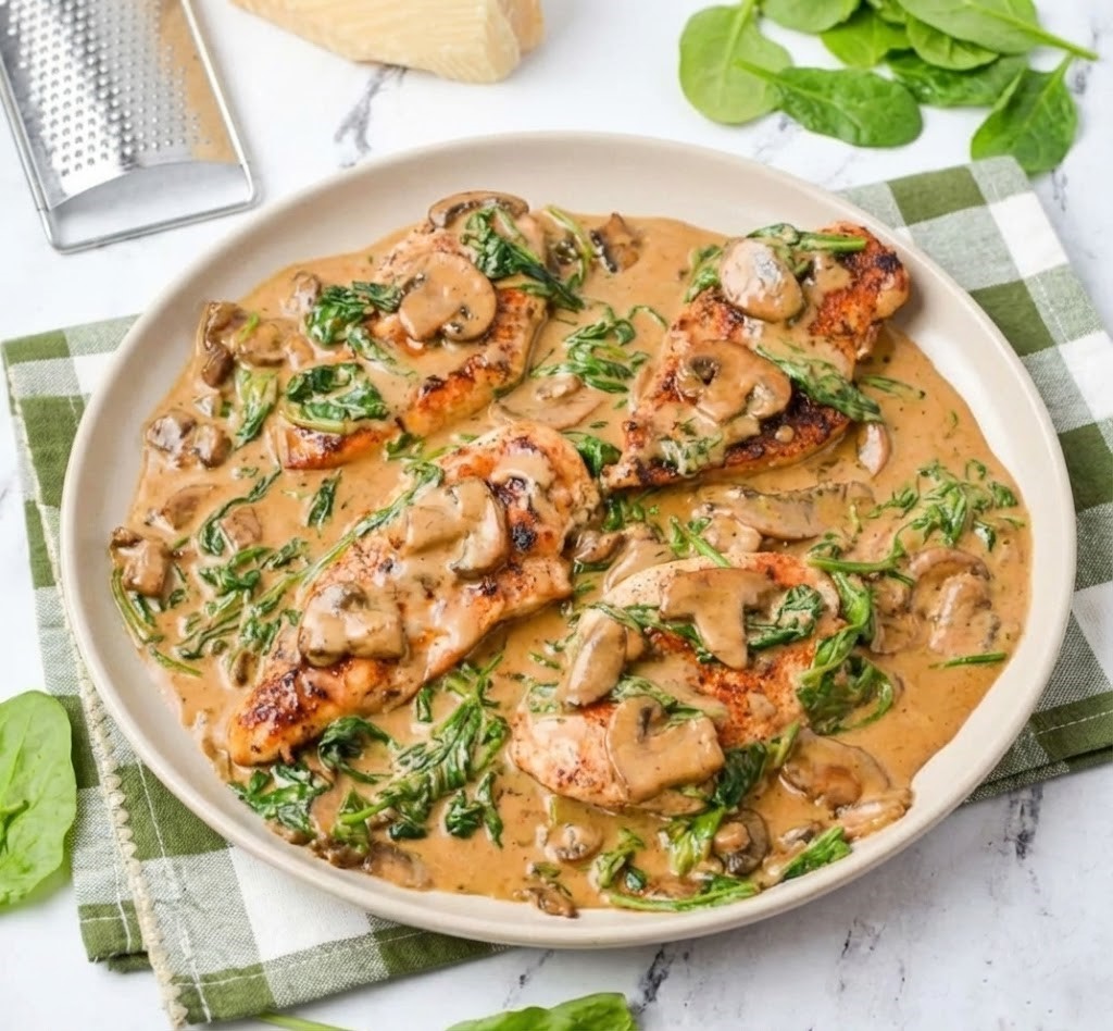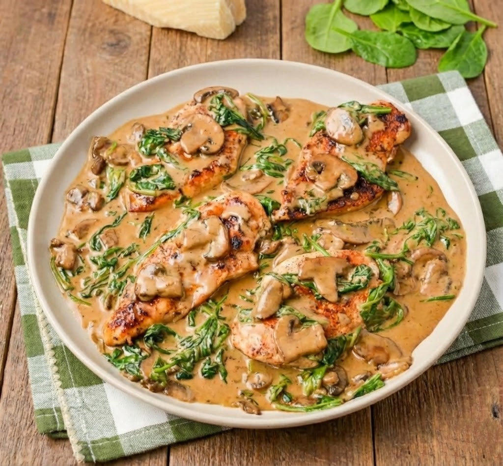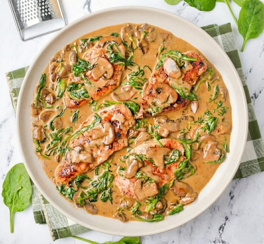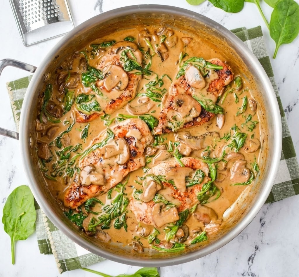 It combines tender chicken with earthy mushrooms and fresh spinach, creating a flavorful and satisfying meal.