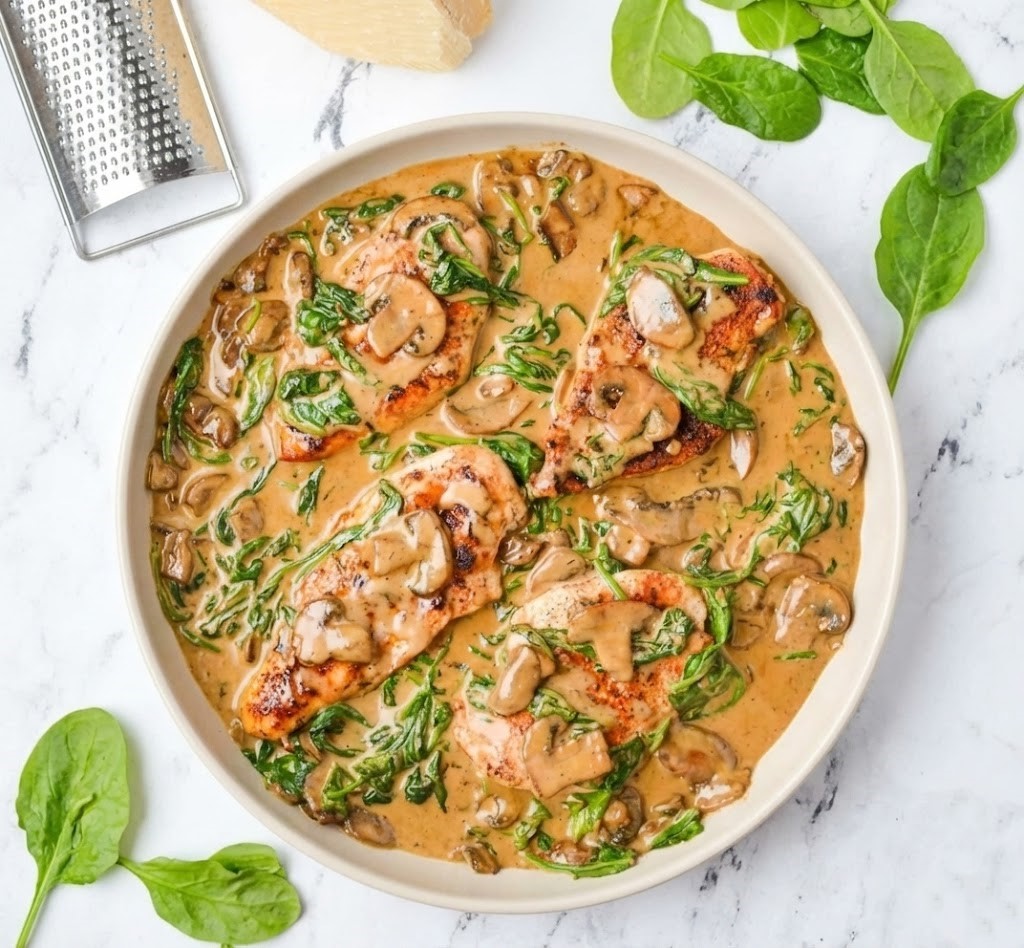 The tender chicken pieces swim in a rich, creamy sauce with earthy mushrooms and vibrant spinach, making each bite comforting and satisfying.