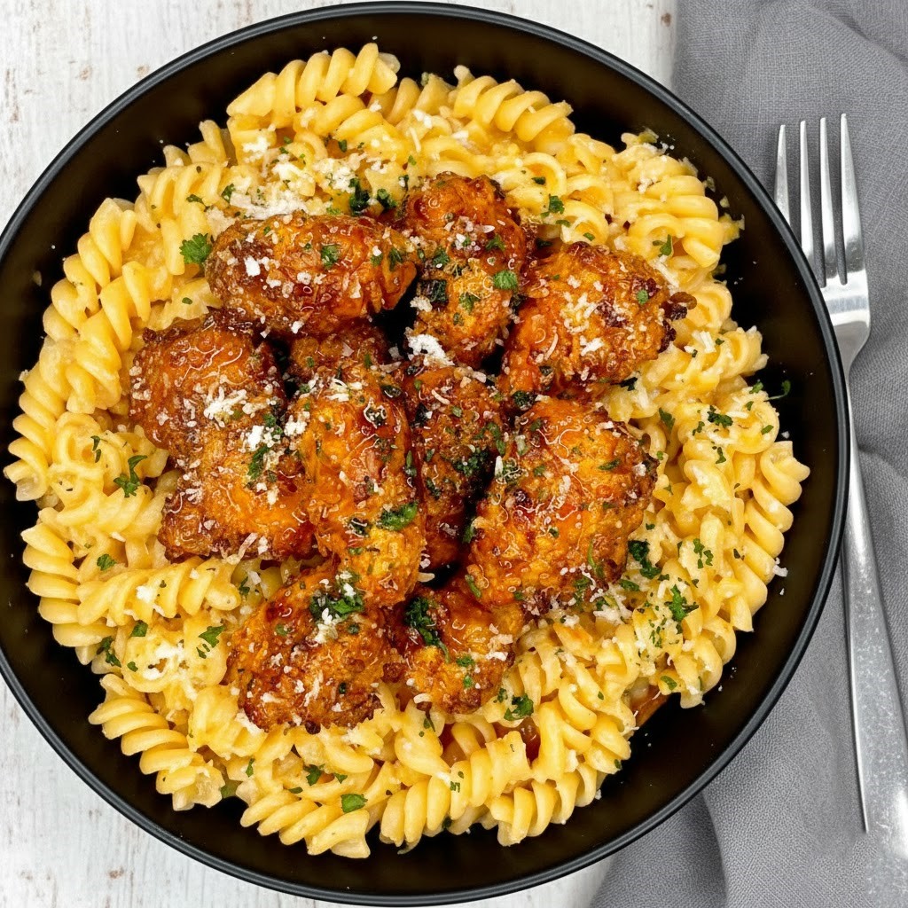 For gatherings, place the pasta in a large serving dish and top with the crispy chicken. It’s perfect for family-style dinners or potlucks.