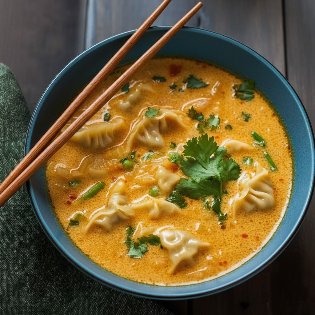 This soup is creamy, spicy, and satisfying all at once. The dumplings absorb the curry, giving a soft, chewy texture that is irresistible in every spoonful.