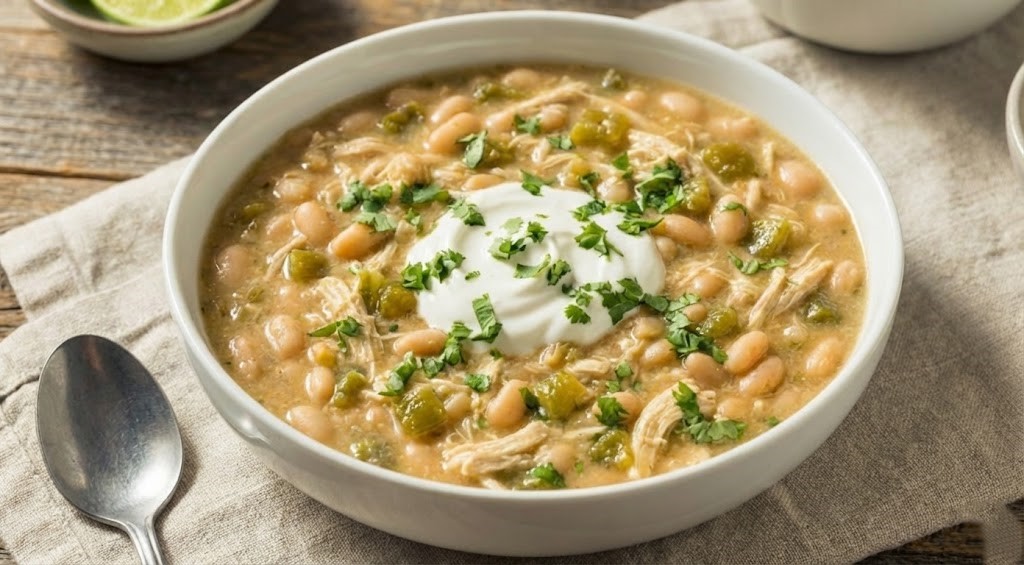 This White Chicken Chili is creamy, comforting, and high in protein. Each bowl is full of tender chicken, soft beans, and mild green chilies that combine beautifully.